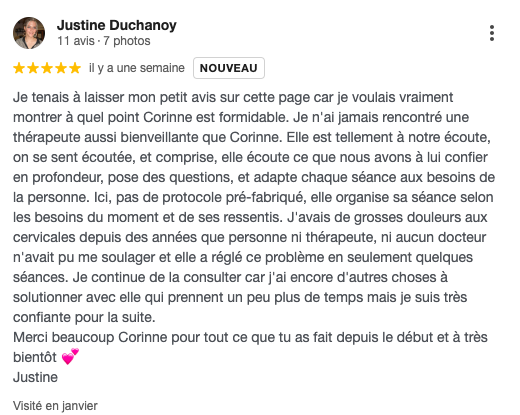 Durant 1h30, je vous accompagne dans la libération de votre principale "problématique". Je n'utilise aucune machine ou équipement.